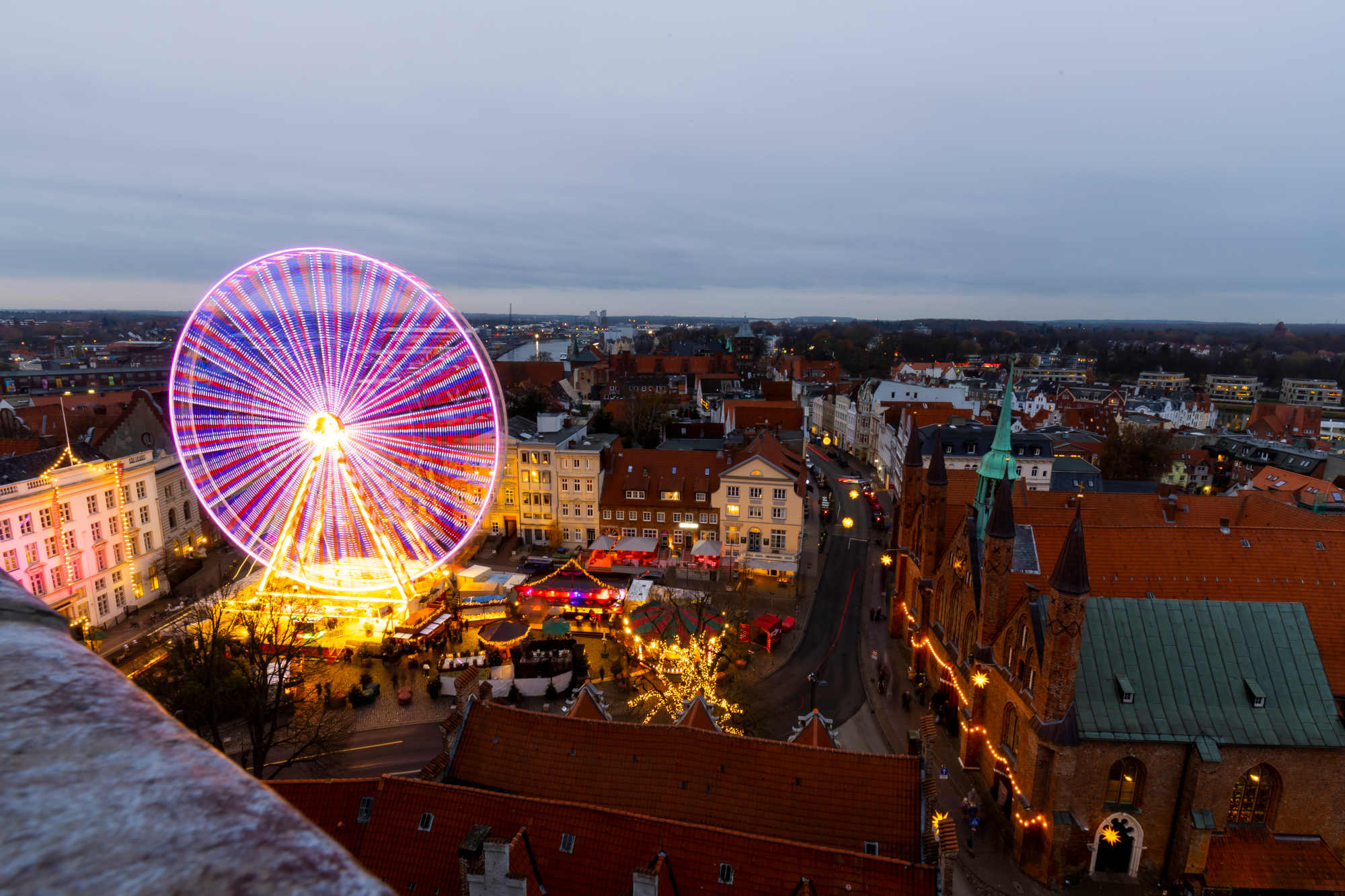 Hanseatische Kulinarikstände kredenzen herzhafte und süße Speisen und servieren heißen Fliederpunsch oder Glühwein. Netze, urige Holzfässer und Strandkörbe bieten Hafenatmosphäre zum Anfassen. Kleine Matros:innen können auf dem Karussell ihre Seetauglichkeit testen. Mit dem Riesenrad geht es hoch hinaus. Trau dich, du wirst mit einem unvergesslichen Blick auf die Lübecker Altstadt und den Hafen belohnt!
